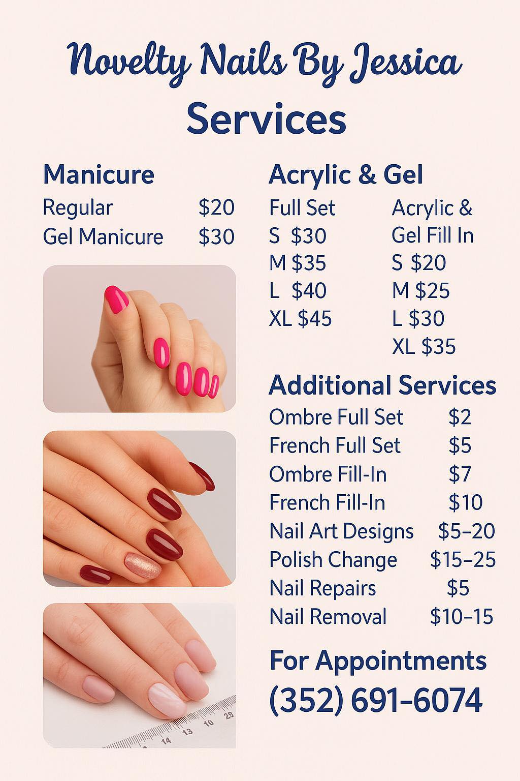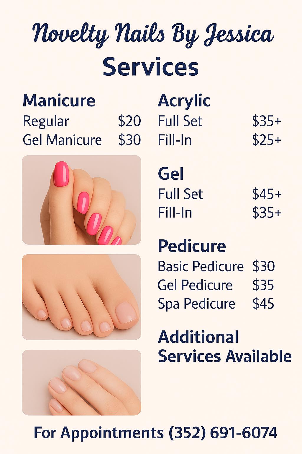Novelty Nails By Jessica: We offer custom nail designs, manicures and pedicures in Spring Hill, FL. Our salon provides a relaxing atmosphere with skilled technicians. At Novelty Nails By Jessica, we use premium products for lasting results. Visit us for creative nail art and pampering!